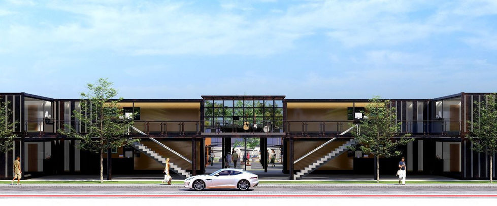 Projeto de uso misto composto por área comercial/gastronômica na parte frontal do terreno e unidades de hospedagem ao fundo, desenvolvido com sistema construtivo modular em contêineres.
